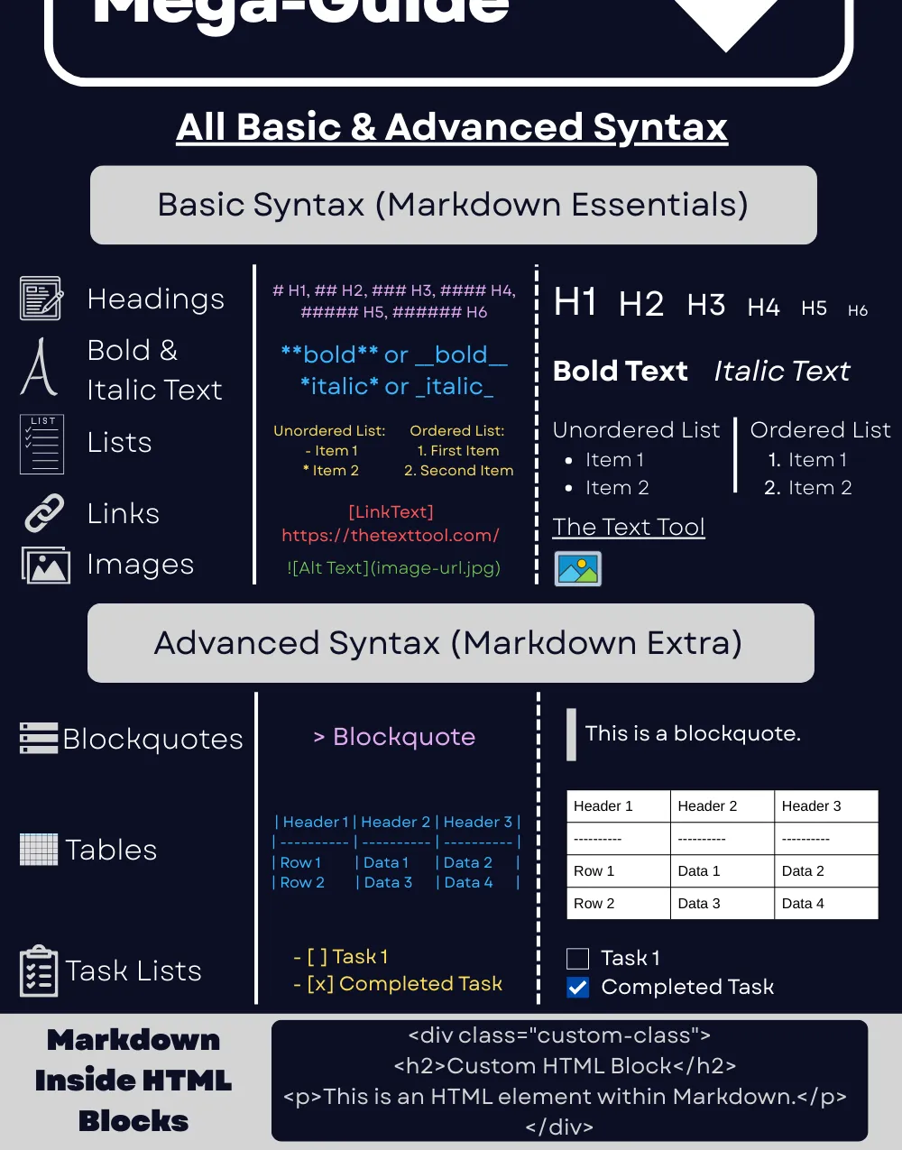 This covers roughly 90% of what you'll use day-to-day. For a detailed walkthrough of each element โ with HTML output comparisons, best practices, and common mistakes to avoid โ see our Markdown Basic Syntax guide. The remaining 10% โ footnotes, definition lists, custom containers โ depends on which Markdown flavor you're using.